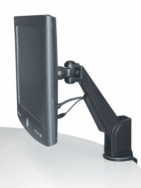 Eleganter LCD Monitorarm für Bildschirme bis 10 kg. Verstellbar praktisch in alle Richtungen: Höhe, Neigungswinkel und Drehung. Wird mit einer einfachen robusten Doppel-Tischklemme am Schreibtisch bis 9 mm Stärke befestigt. Inklusive Kabelführungskanal. Vesa Befestigungsstandard 75 x 75 mm oder 100 x 100 mm.