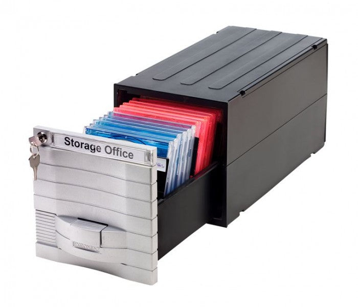 Modulare Schubladenbox für bis zu 28 CDs/DVDs in der Standard Jewel Box, 56 im Slim Case oder sonstige Datenträger gemischt. Hergestellt aus antistatischem Kunststoff und ausgestattet mit Schloss und Schlüssel, garantiert dieses Archivsystem eine professionelle und geschützte Ablage von großen Mengen an Datenträgern. Zum Lieferumfang gehören: Metallschloss und Schlüssel, 5 Trennblätter und Verbindungsclips zum Erweitern mit anderen Modulen.
