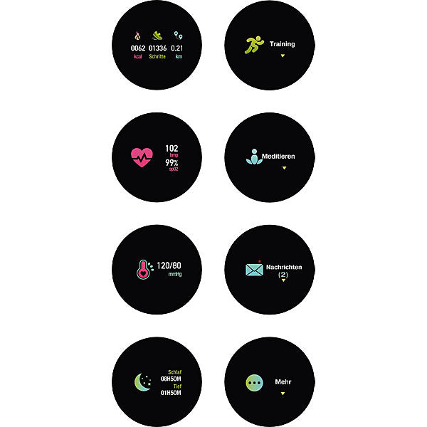 - Messung von Herzfrequenz, Puls, Sauerstoffsättigung des Blutes, Schlafüberwachung, Kalorienverbrauch, Schrittzähler und zurückgelegte Distanz