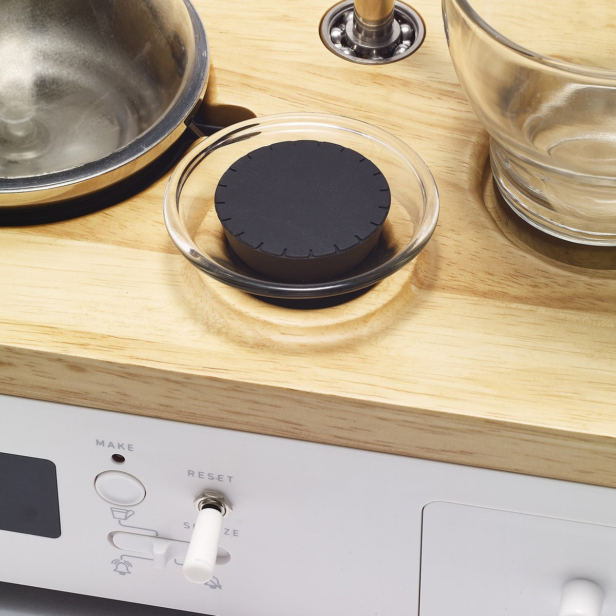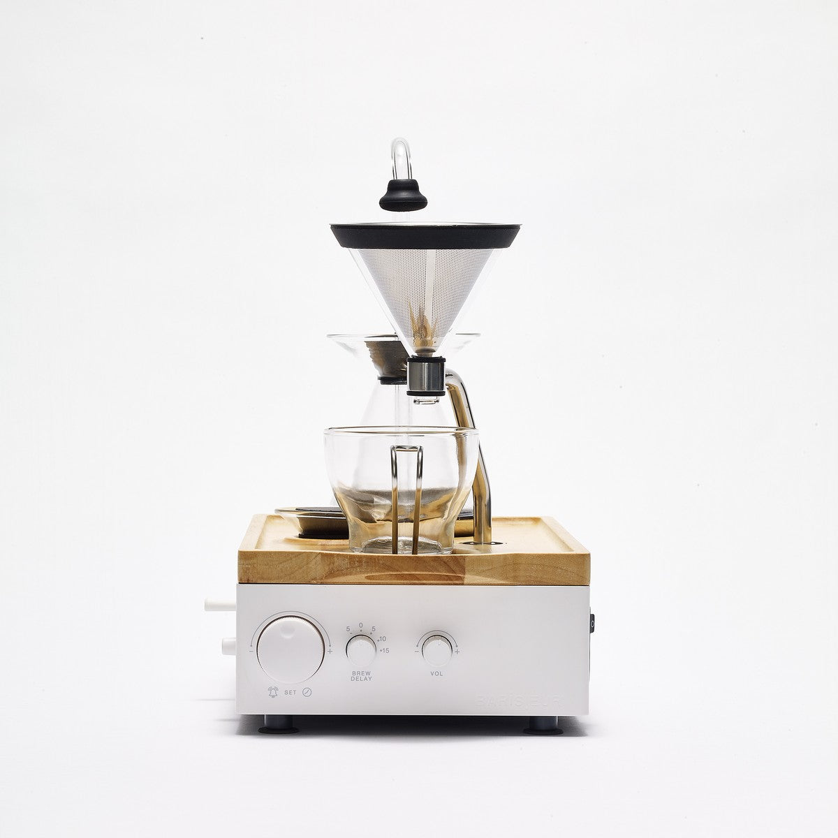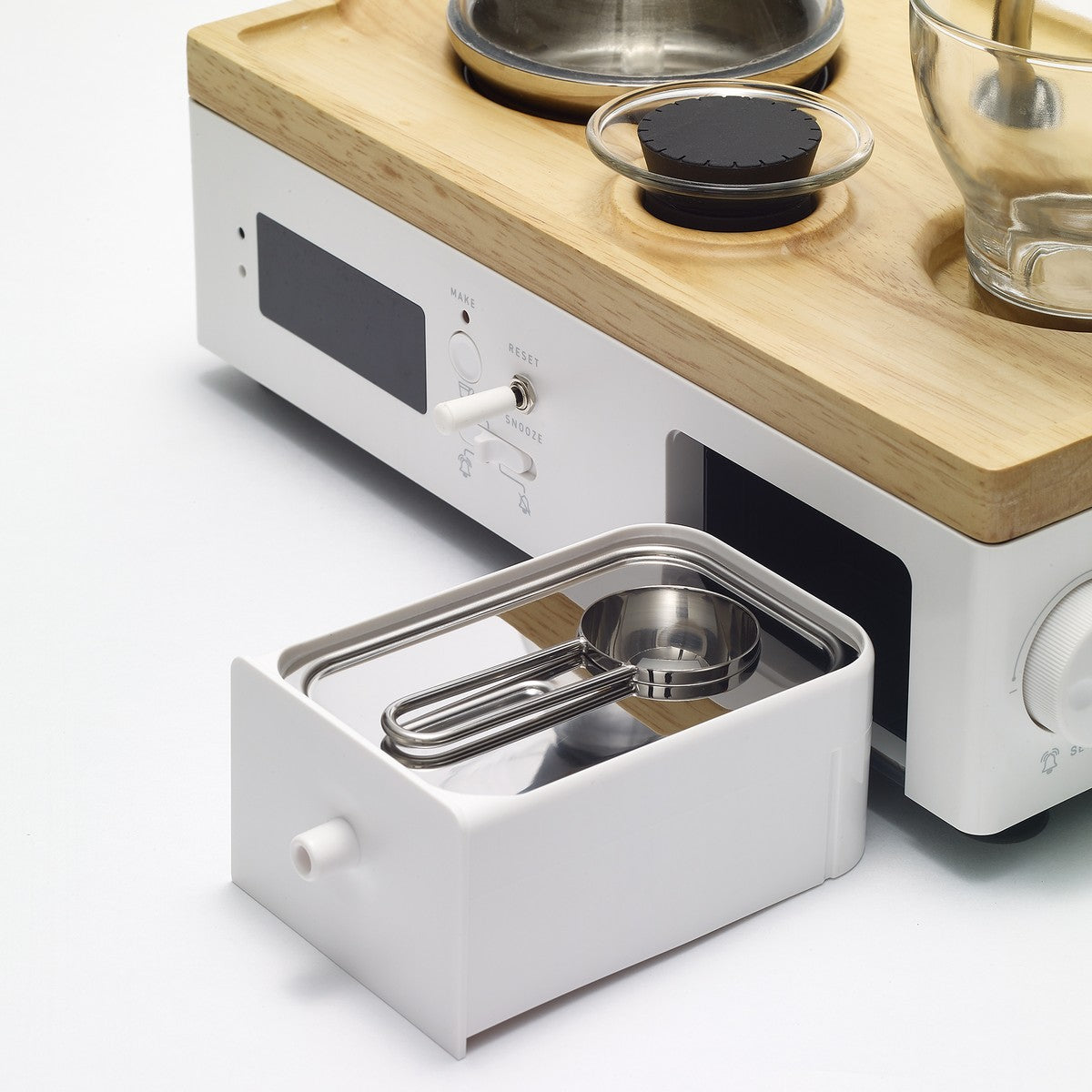 Ihr persönlicher Guten-Morgen-Barista Erleben Sie die ultimative Kaffee- und Teezubereitung mit dem Barisieur Kaffee- und Teebrühwecker von Joy Resolve. Es erwarten Sie elegante Handwerkskunst mit handbearbeitetem Holz und mundgeblasenem Glas, Brew-To-Wake- und Brew-On-Demand-Funktion, Wecker, USB-Ladeanschluss, ein Mini-Milchkühlschrank und intuitive Bedienelemente für die Einstellung des Weckers und der Brühpräferenz. Die Glasbehälter werden aus 3 mm dickem Borosilikatglas hergestellt, das verschleißfest, hitzebeständig und robust ist. Unabhängig davon, ob ein Ersatzglas benötigt wird oder ob ein Glas doch einmal zerbricht, sind Ersatzgläser optional erhältlich. Das Holztablett wird aus massivem Holz maschinell gefertigt und durchläuft einen Handfertigungsprozess. Da das Holz aus FSC-zertifizierten Wäldern stammt, wird sichergestellt, dass das, was gebraucht wird, wieder zurückgegeben wird, damit unsere Wälder gesund bleiben und weiterhin wachsen. Bewahren Sie problemlos einen Wochenvorrat an Kaffeepulver oder Teeblättern in der eingebauten Schublade auf. Ein Messlöffel und ein Deckel sind ebenfalls enthalten, um alles frisch zu halten. Ein Kaffee- und Teebrühwecker am Bett taugt nichts, wenn man in die Küche gehen muss, um Milch zu holen. Aus diesem Grund wurde ein Peltier-betriebener Mini-Kühlschrank eingebaut, der Ihre Milch bei einer perfekten Temperatur von 3 bis 5°C rund um die Uhr frisch hält. Die Timerfunktion kann über Knöpfe am Gerät eingestellt werden. Wachen Sie sanft mit dem Geräusch Ihrer Kaffee- oder Teebrühung oder mit einem begleitenden Alarm auf. Während die Größe der Barisieur Maschine von den Bildern täuschen kann, passt sie dennoch gut auf Ihren Nachttisch oder Ihre Theke. Das zeitlose Design und die minimale Ästhetik versprechen Ihren Wohnbereich aufzuwerten, selbst wenn sich Ihr Stil ändert und Ihre Einrichtung aktualisiert wird. Funktionsweise Die Intelligente Induktionsspule kocht das Wasser innerhalb von 3 Minuten und heizt nur den Kochkessel auf, mit automatischer Abschaltung. Dieser wird aus aus lebensmittelechtem Silizium und einer dünnen, lasergeätzten Edelstahlplatte hergestellt, so verliert das kochende Wasser beim Durchlauf nicht seine Wärme und die vollständige Extraktion des Kaffees bei 94°C wird gewährleistet. Die Auto-Dim-Anzeige dunkelt nachts automatisch ab und kann bei Bedarf ausgeschaltet werden. Das Display zeigt an, auf welche Zeit Sie Ihren Wecker und den Sud eingestellt haben. Der neu gestaltete "Duschkopf" imitiert ein sanftes Übergießen auf den gemahlenen Kaffee oder Tee. Dadurch wird ein vollständiges und gleichmäßiges Eintauchen des Kaffeepulvers oder der Teeblätter erreicht. Durch das vollständige Eintauchen des Tees werden sogar ätherische Öle hieraus extrahiert.