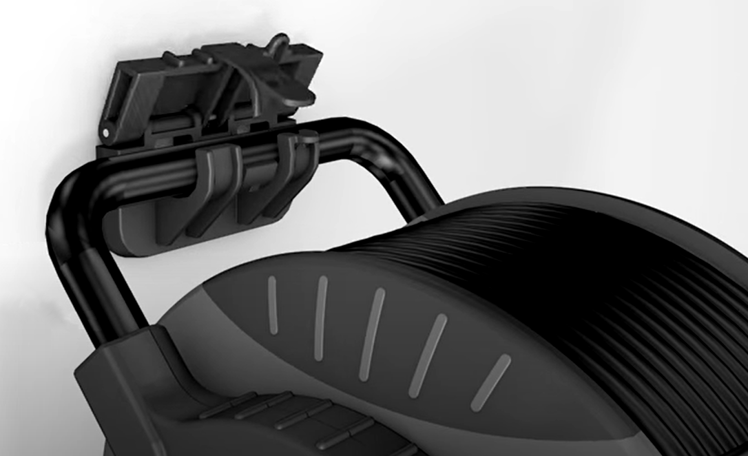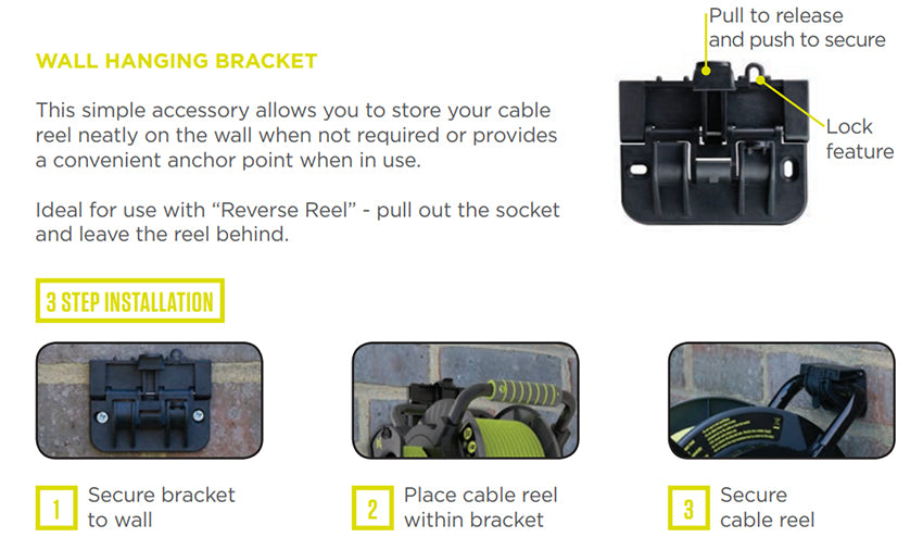 - Dieses einfache Zubehör gestattet das Aufhängen der Kabeltrommel an der Wand, wenn sie nicht benötigt wird, oder bietet bei Verwendung eine praktische Lösung, damit sie nicht im Weg ist
