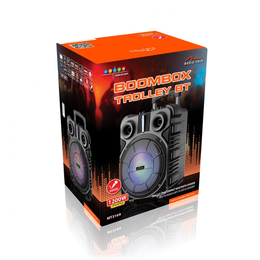 BOOMBOX TROLLEY BT MT3169 ist der neueste große "Koffer" Bluetooth-Lautsprecher mit einer Gesamtleistung von RMS 50 W, PMPO 1200 W.
