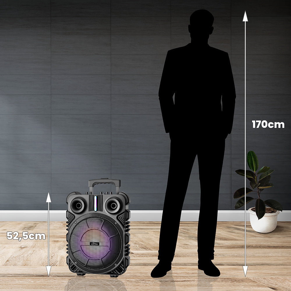 Ein tragbares, aktives Lautsprechersystem und Karaoke-System in einem Gerät. Der Lautsprecher ist eine perfekte Ergänzung für Hauspartys, Outdoor-Events, Lagerfeuer usw.