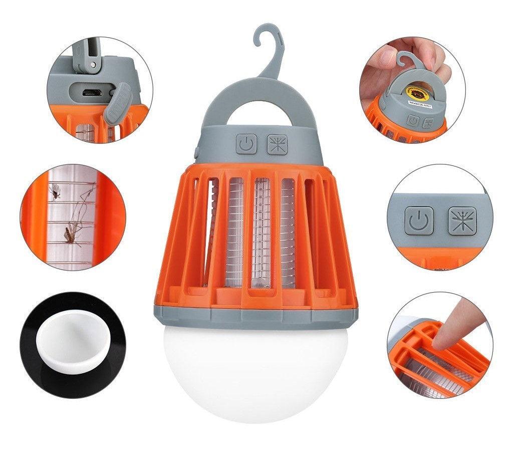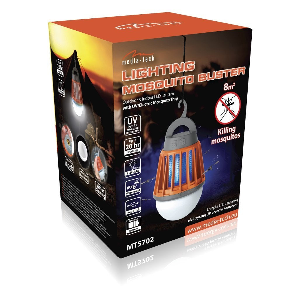 Media-Tech präsentiert tragbare LED-Lampe mit UV-Mückenschutz - LIGHTING MOSQUITO BUSTER MT5702 - Schützt Räume effektiv vor verschiedenen Fluginsekten. UV-Licht zieht Mücken in das Stromnetz. Es arbeitet effektiv im Bereich von 4m3 - funktioniert perfekt in Wohnungen, Häusern, Zelten und kleinen Räumen. Die abgegebene UV-Strahlung (360-400nm) ist für Mensch und Tier völlig unbedenklich, außerdem isolierter Kunststoff Gehäuse garantiert eine sichere und lange Lebensdauer der Lampe. Das Gehäuse ist wasserdicht (IPX66), sodass wir es sicher unter fließendem Wasser waschen können. Mit dem ausklappbaren Haken können Sie die UV-Lampe überall aufhängen. Halten Sie die Lampe für einen besseren Effekt von anderen Lichtquellen fern. Eine wichtige Funktion des Gerätes ist die LED-Lampe (200lm) mit einstellbarer Helligkeit (3 Stufen). LIGHTING MOSQUITO BUSTER ist eine großartige Kombination aus einer tragbaren LED-Lampe und einer Insektizidlampe. Der eingebaute Lithium-Ionen-Akku mit einer Kapazität von 2000 mAh bietet eine Betriebsdauer von bis zu 20 Stunden (voll aufgeladen). Der MT5702 wird über den Micro-USB-Anschluss aufgeladen.'
