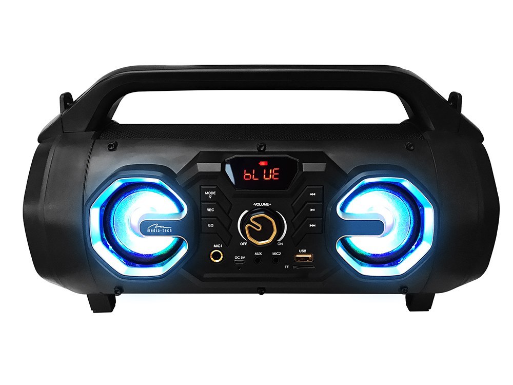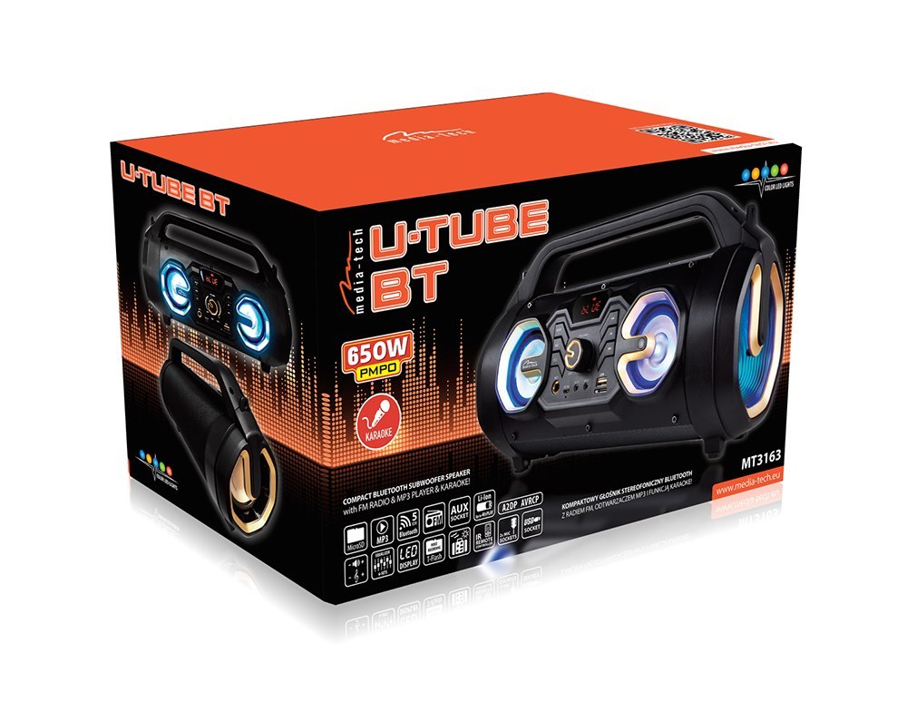 U-TUBE BT MT3163 mit eingebautem 4"-Subwoofer und zwei 3"-Mitteltönern mit einer Gesamtleistung von 18W RMS, PMPO 650W.