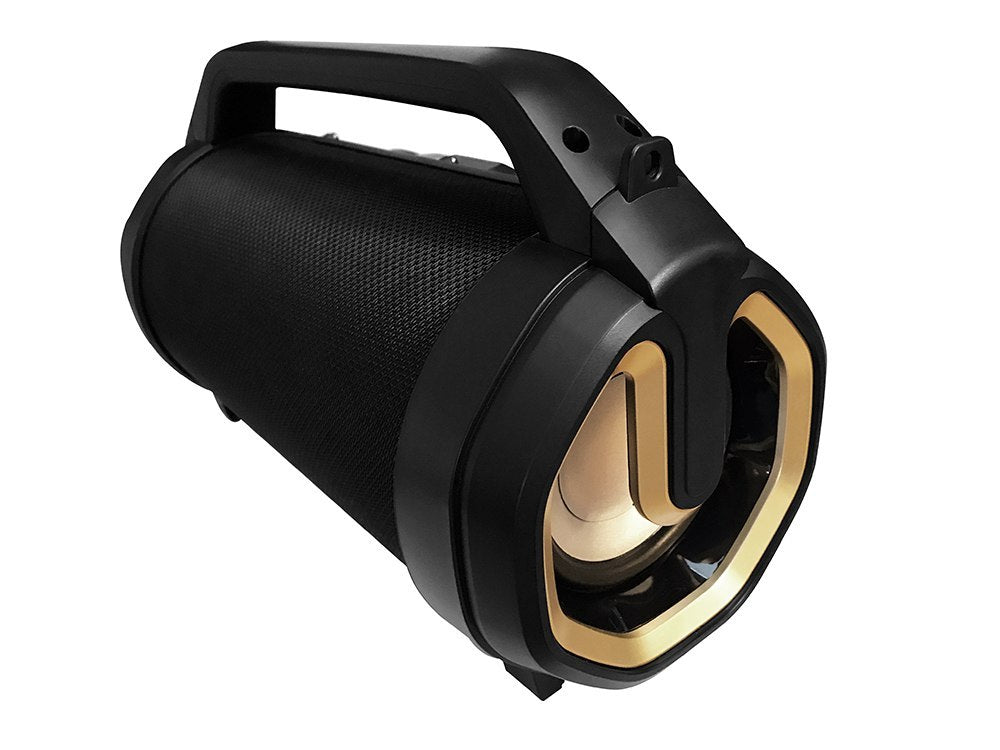 Oben am Gerät befindet sich ein Griff, mit dem wir den Lautsprecher an jeden beliebigen Ort bewegen können. Unter dem Lautsprecher befinden sich rutschfeste Füße, dank denen der Lautsprecher stabil steht