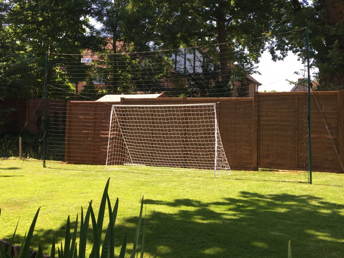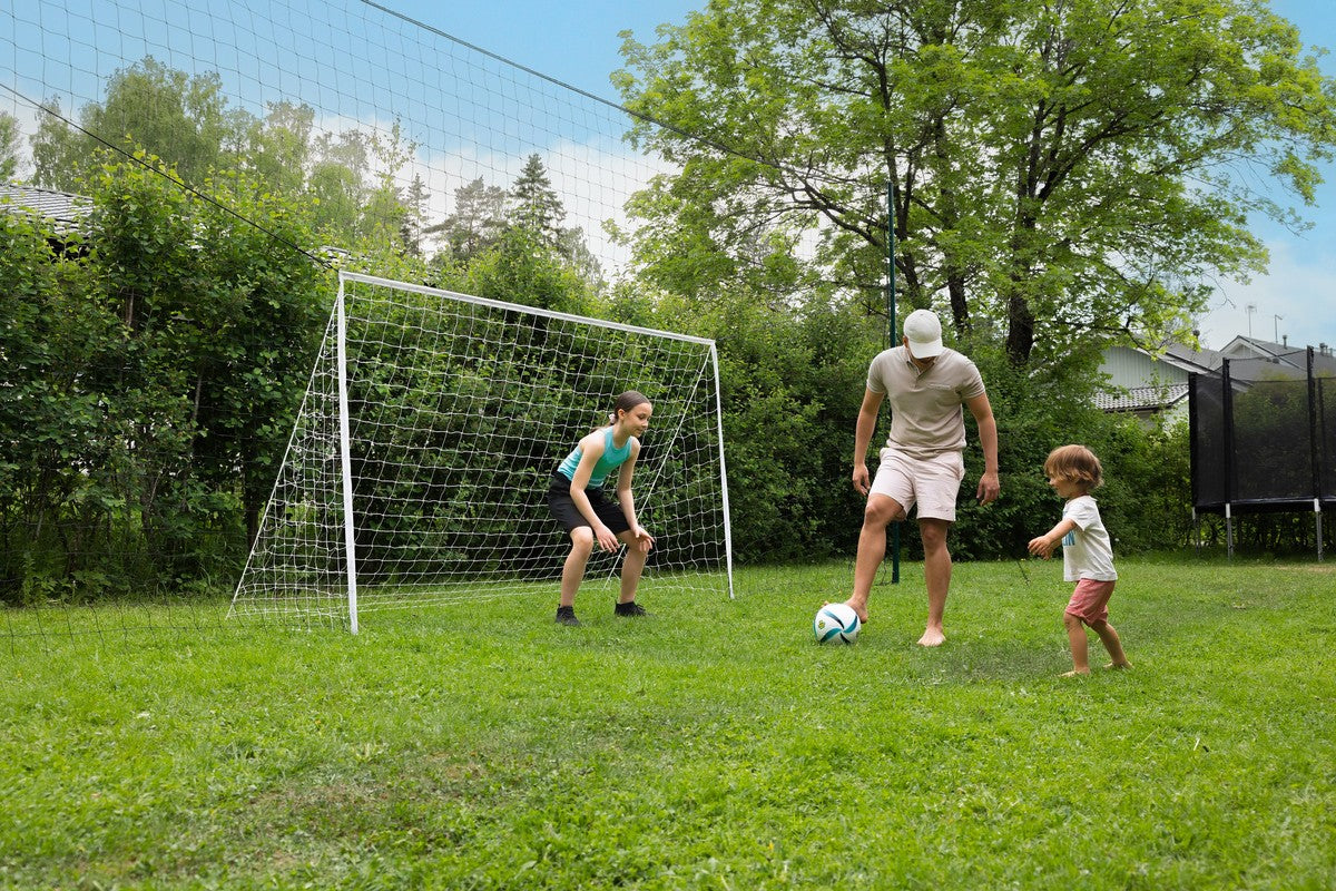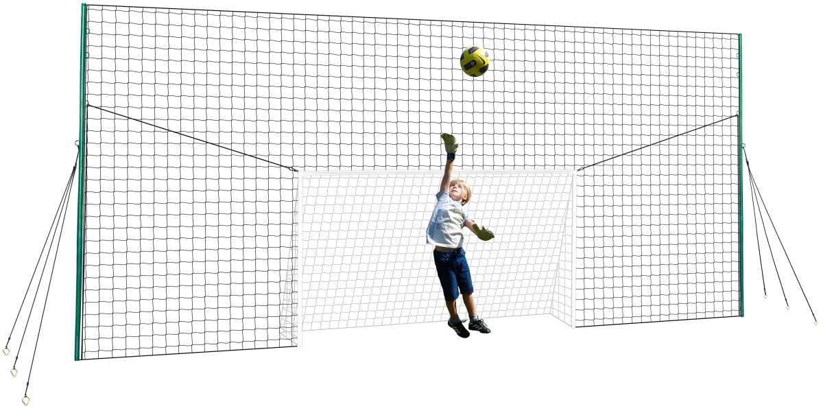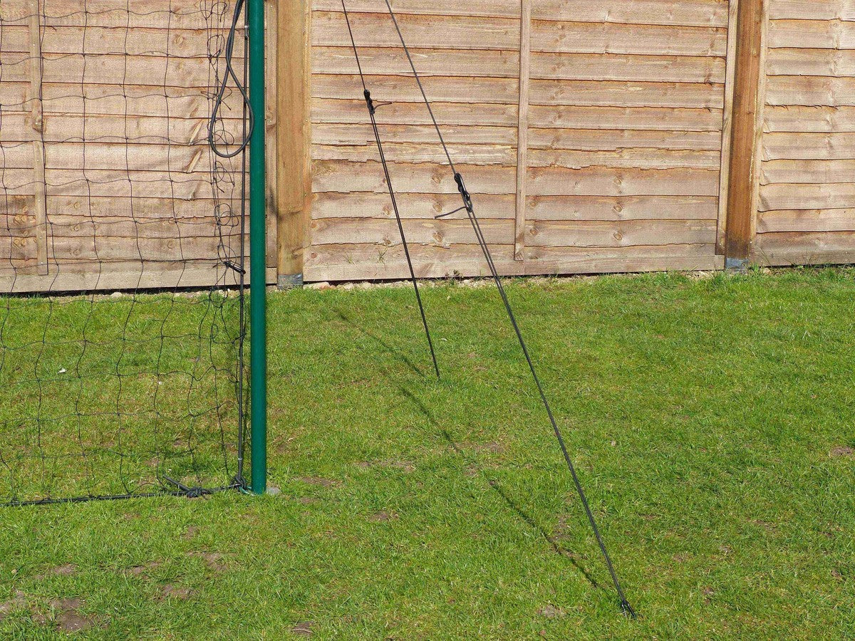 Abmessungen – Weißes Tor: 2,7 m x 1,6 m. Schwarzes Abfangnetz: bis zu 6,6 m breit x 3 m hoch. Abspannseile reichen darüber hinaus.